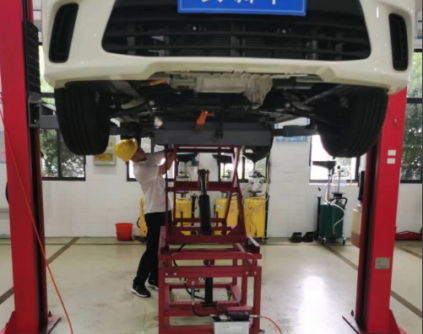 ? ? ? ?舉升車輛車身離地至1.7米左右(根據(jù)身高適合拆卸動力電池高度),落鎖并再次確定支撐平穩(wěn)
